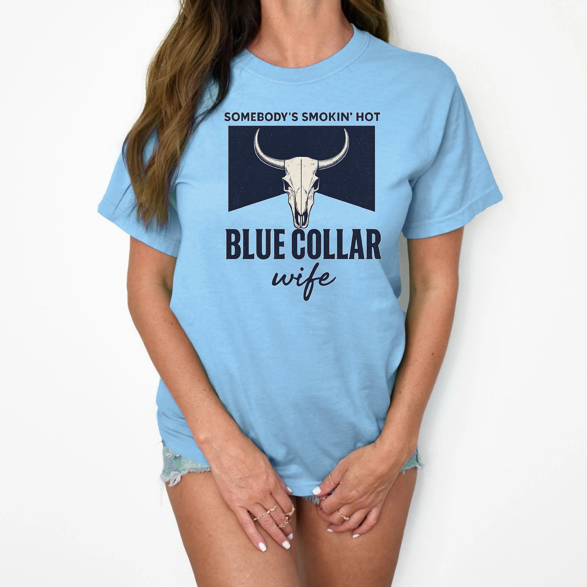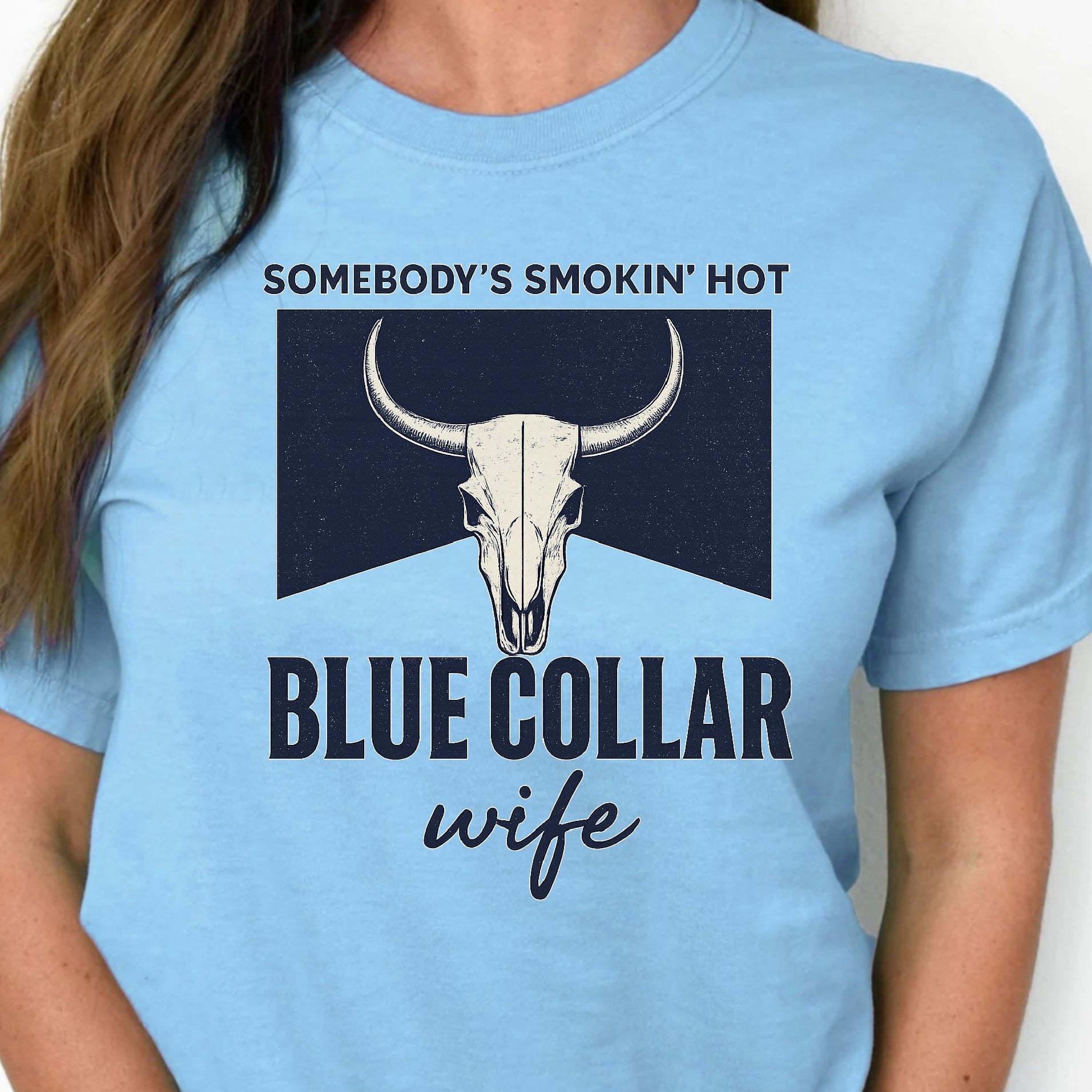 DTF Transfer Blue Collar Wife – Somebody’s Smokin’ Hot Western Skull Design