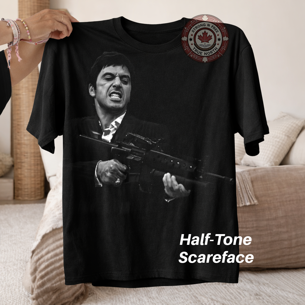 A halftone is a print style that uses tiny dots instead of solid ink to create shading and photo detail. In DTF and screen print transfers, halftones give designs a softer feel, better breathability, and a vintage / photo-real look while reducing heavy ink buildup on the garment.