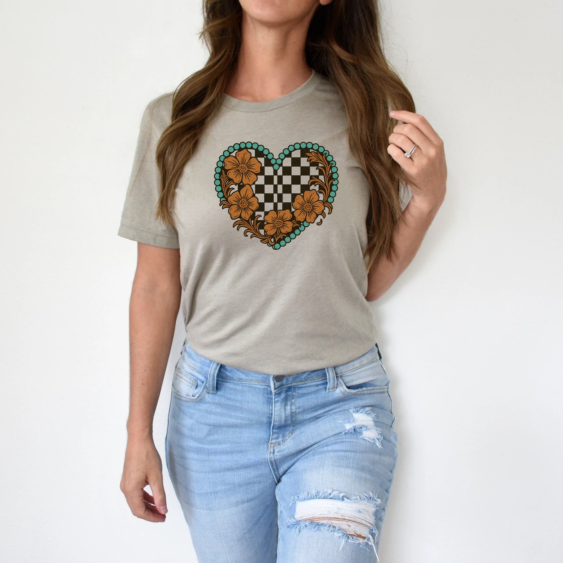 DTF Transfer Checkerboard Western Heart – Turquoise Floral Retro Country Style