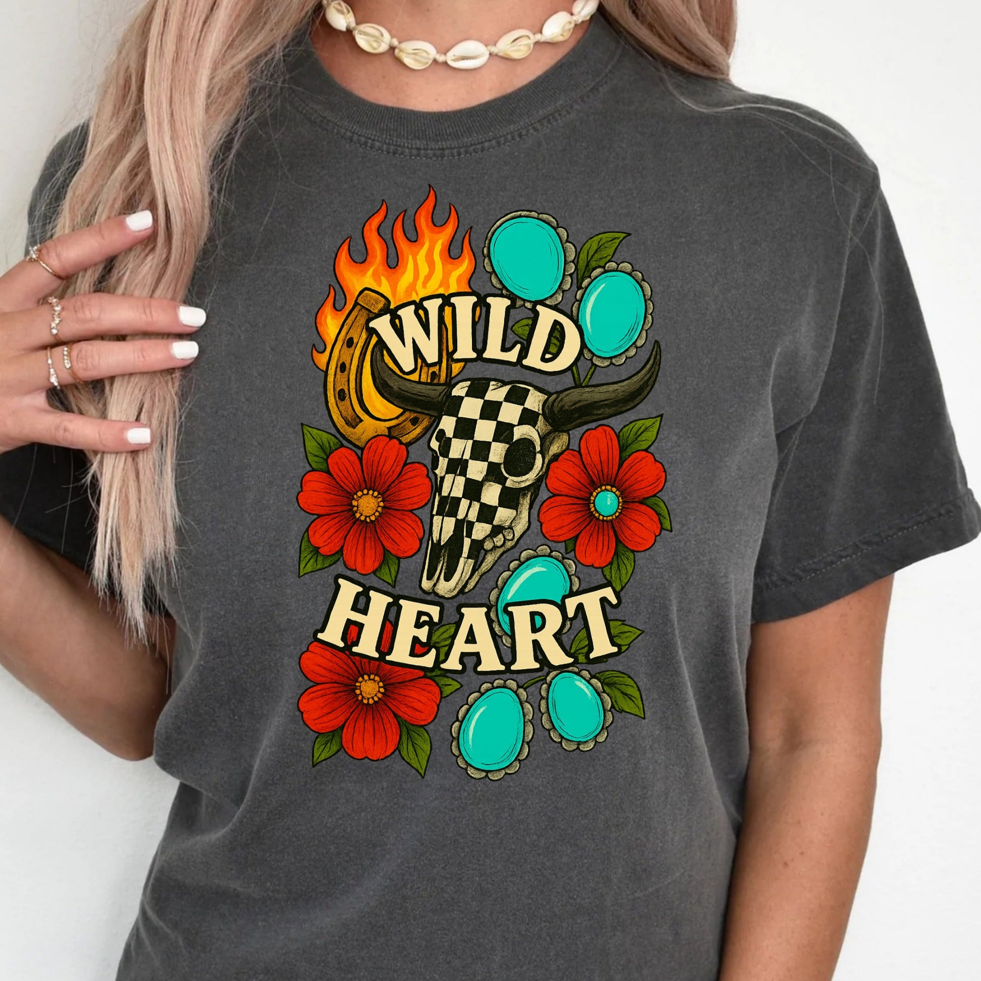 DTF Transfer Wild Heart – Western Cowgirl Checker Skull with Turquoise & Floral Flames