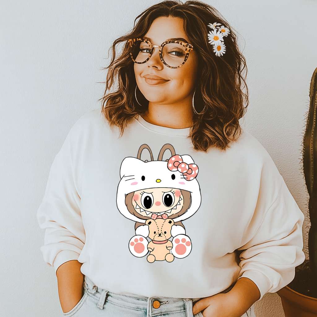 Hoody T-Shirt Crewneck Kawaiii Girl in Hello Kittty Onesie – Cute Anime Style with Teddy Bear