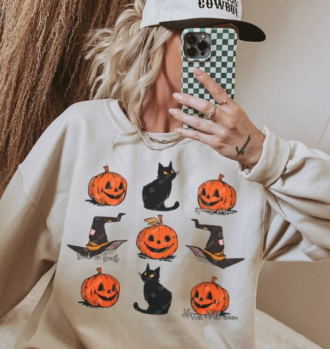 Sweatshirt Hoodie Or T-Shirt Fall Halloween Cats Pumpkins Black Hats