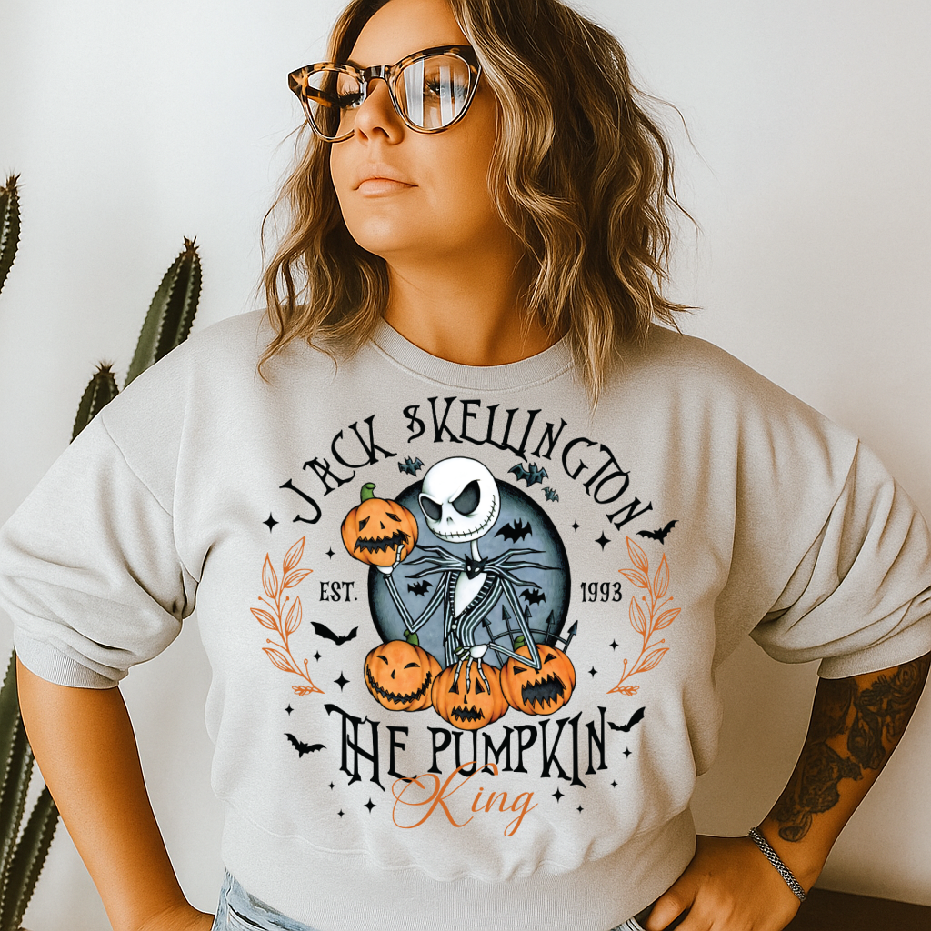 With a fit so comfortable, you'll feel like you're wrapped in a warm hug from your favorite spooky skeleton, this sweatshirt allows for maximum movement—ideal for those unexpected Halloween dance-offs! The whimsical design featuring Jack Skellington and his pumpkin pals will have you looking frightfully fabulous, whether you're sipping cider or scaring the neighbors.