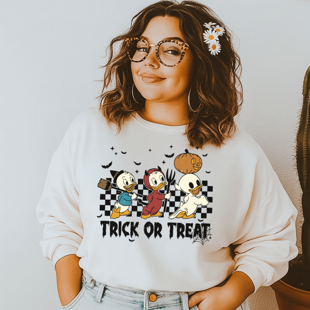 T- Shirt Crewneck Halloween – Trick or Treat Duck Trio Vintage Cartoon Design Sweatshirt
