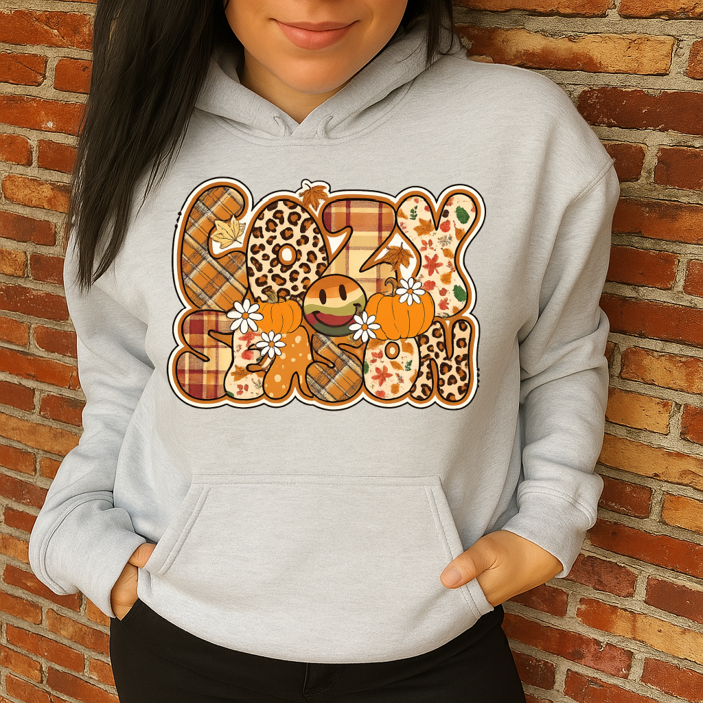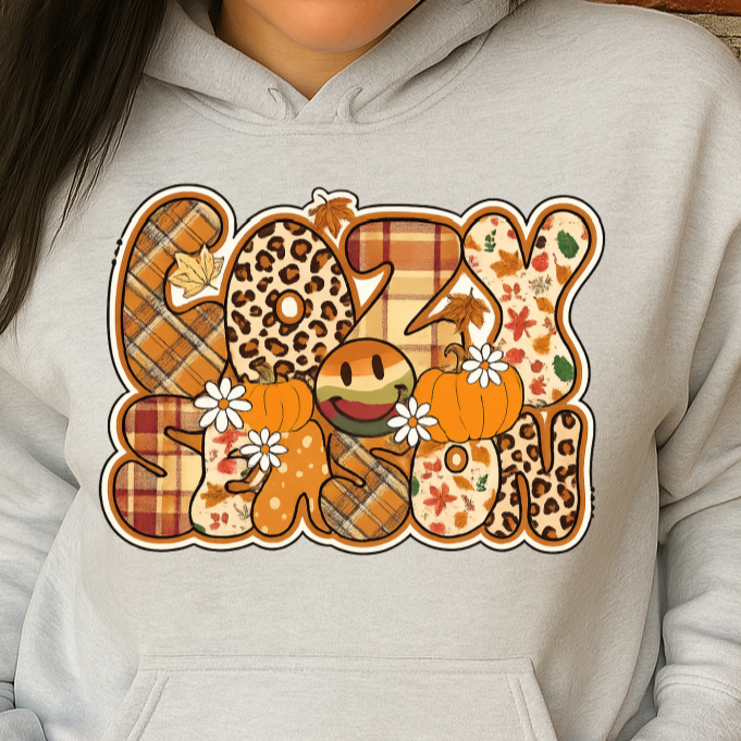 Adorned with a delightful patchwork of charming fall motifs—including playful pumpkins, timeless plaid, and a touch of wild leopard print—this hoody is a celebration of autumn's vibrant spirit. The whimsical smiley face adds a joyful twist, ensuring that you not only look chic but also feel uplifted as you embrace the season.