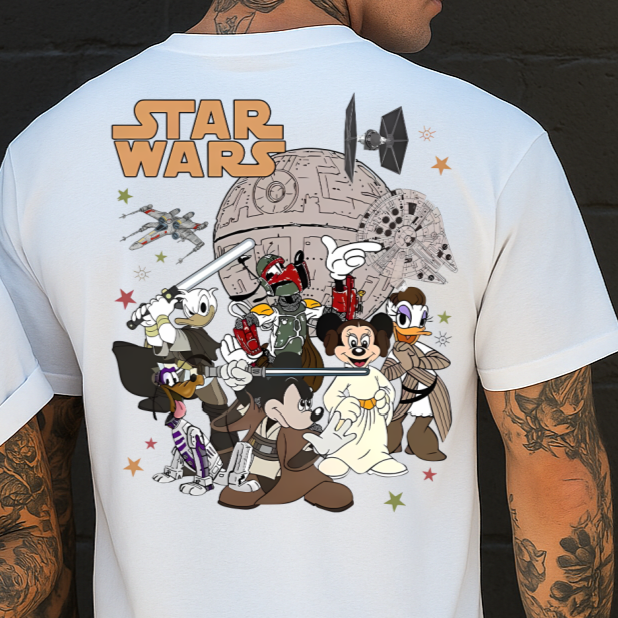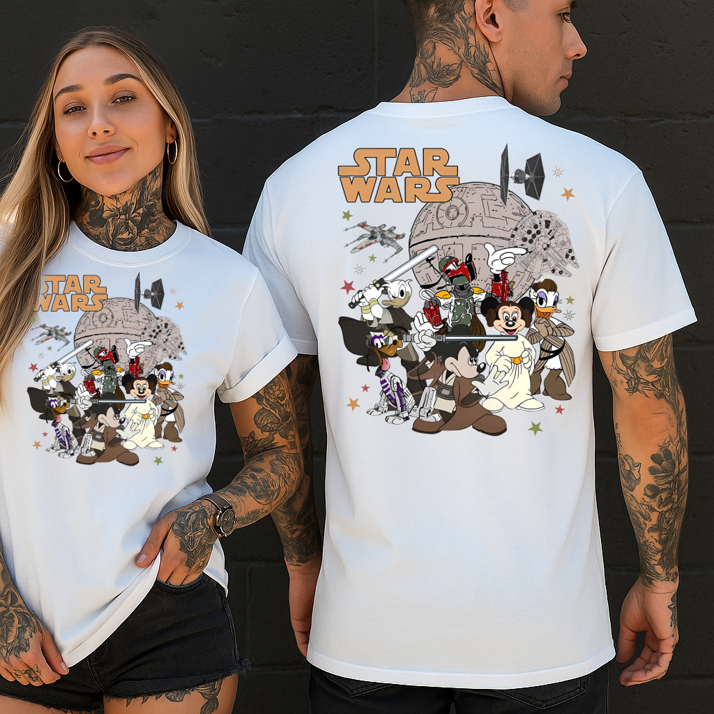 Step into a universe where comfort meets creativity with our T-Shirt Hoody Crewneck Dis Starr Wars Tee – a vibrant celebration of camaraderie featuring Mick, Min, Donald, and their friends in an unforgettable galactic mashup. Crafted from high-quality fabric, this tee is not just clothing; it’s a canvas for your adventures, designed to inspire movement and freedom in your everyday life.