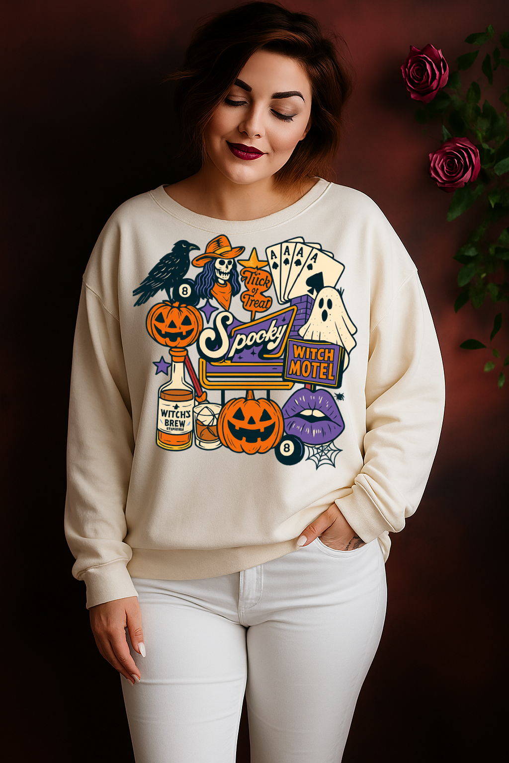 T-Shirt Hoody Crewneck – Spooky Halloween Motel Design with Pumpkins, Ghost, Witch Brew & Skeleton