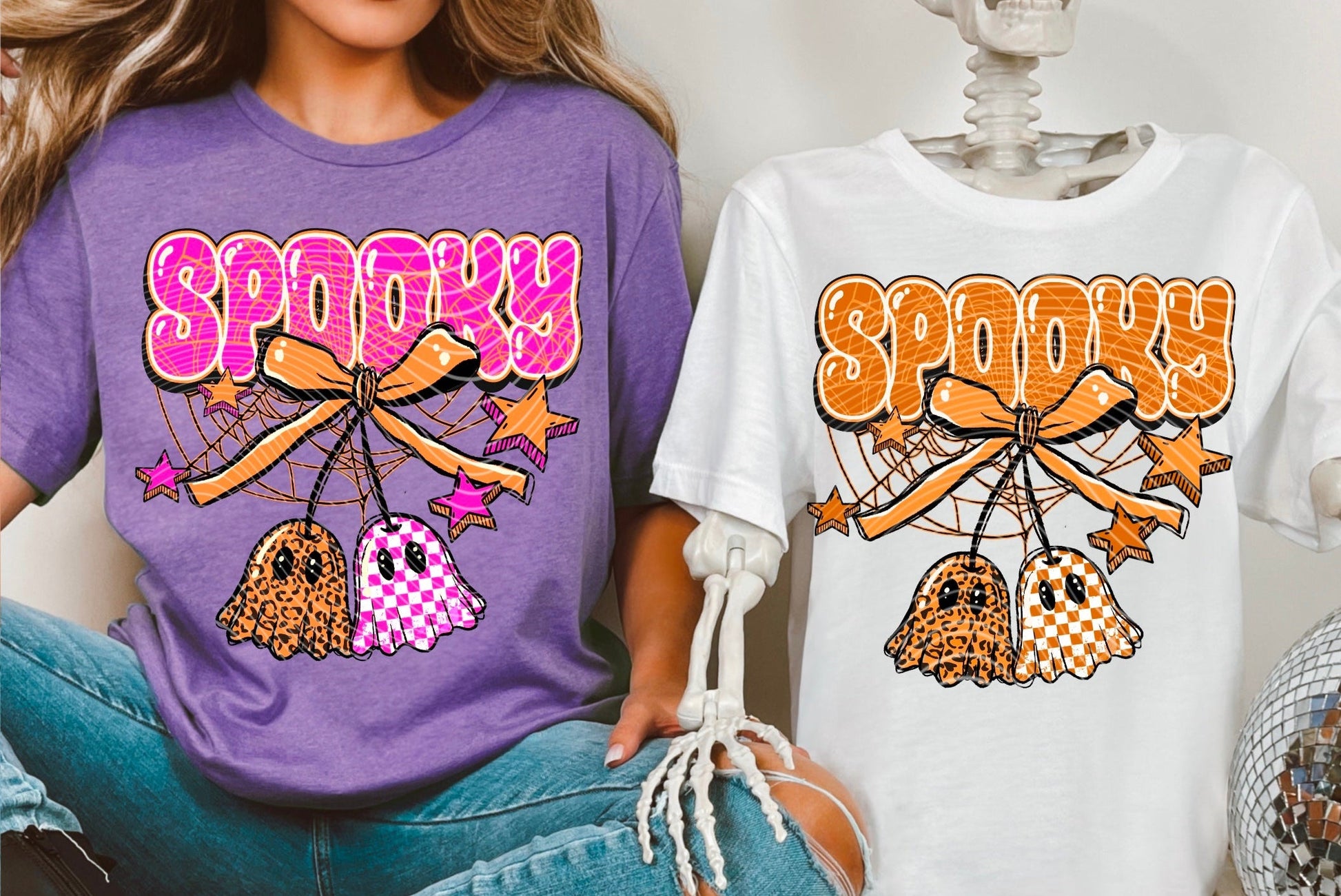 T-Shirt Hoody Spooky Ghost Duo with Bows – Retro Pink & Orange