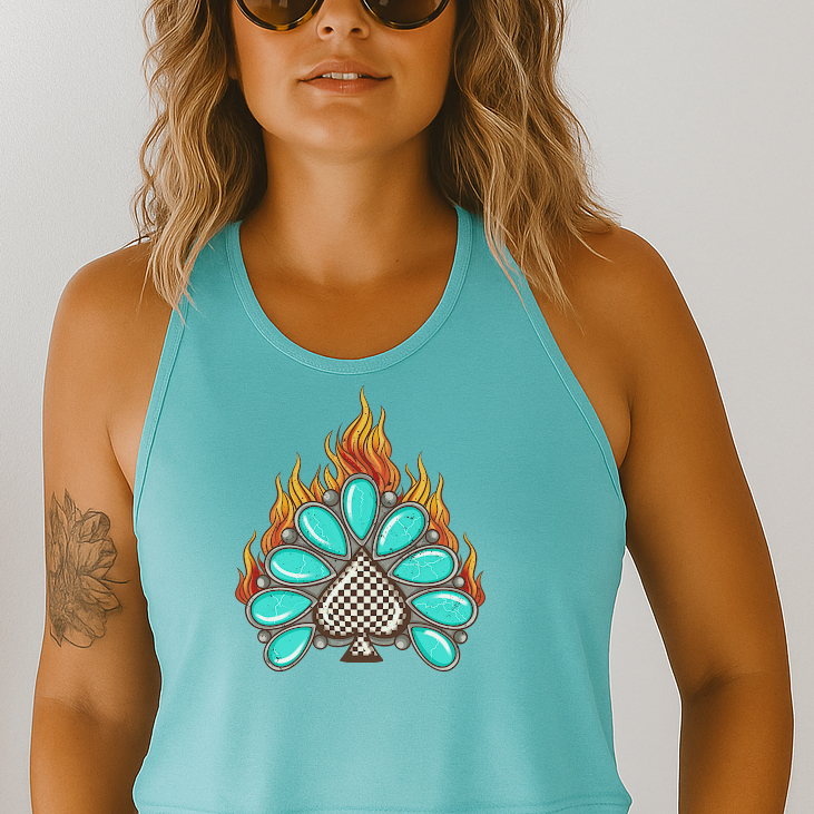 T-Shirt Or Crewneck Hoodie – Turquoise Spade & Flames with Checkered Center Western Rock Vibe