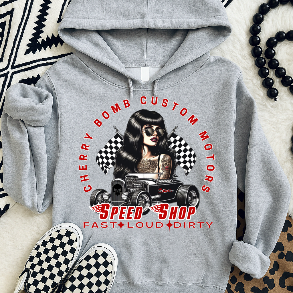 Stay cozy and stylish with our T-Shirt, Hoodie, or Sweatshirt featuring the Cherry Bomb Custom Motors – Pin-Up Speed Shop design. Made from high-quality fabric, each piece offers exceptional comfort and allows for easy movement, making it perfect for daily wear or relaxing at home. Available in four classic styles, these garments are a versatile addition to any wardrobe. The striking design showcases a vibrant pin-up graphic that adds a touch of retro flair to your outfit. Whether you're out on a casual errand or hanging out with friends, this apparel provides both warmth and a fashionable edge. Embrace comfort and individuality with this unique collection.