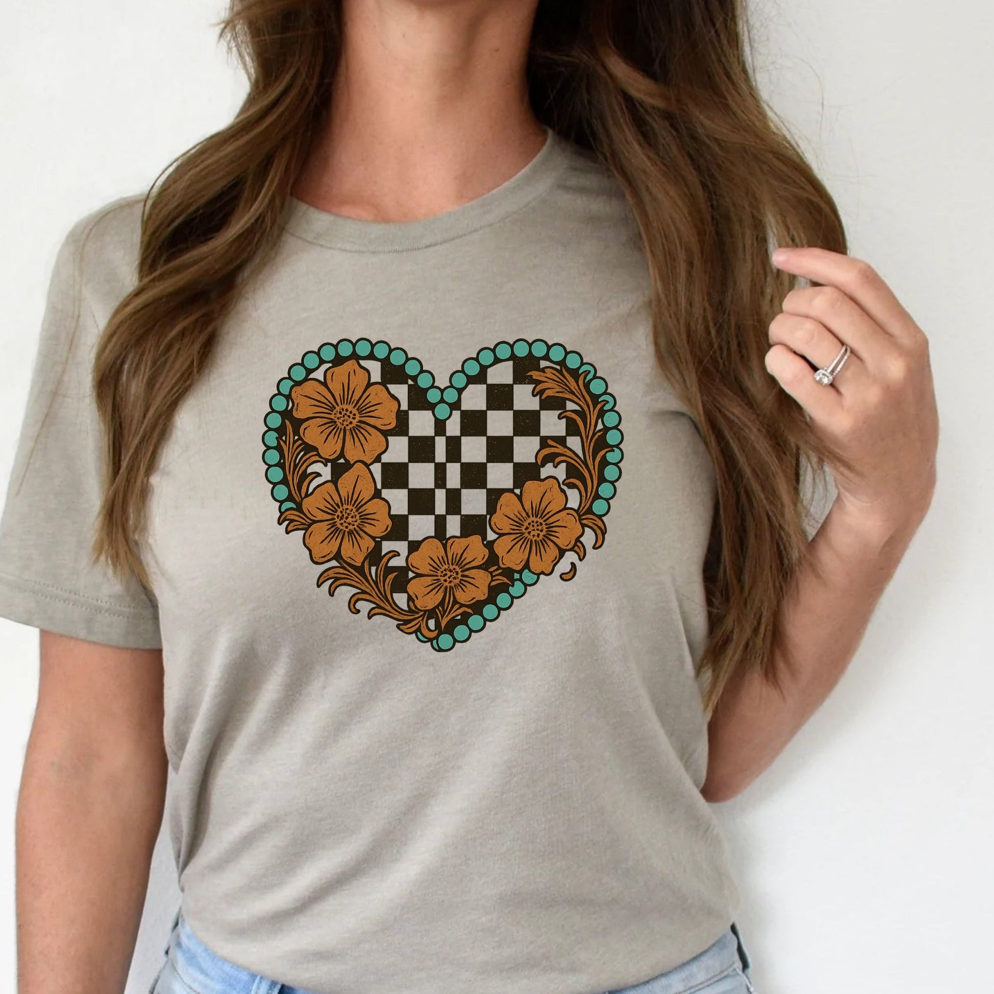 T-Shirt Sweatshirt Crewneck Checkerboard Western Heart – Turquoise Floral Retro Country Style