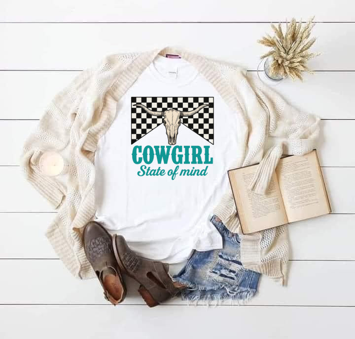 T-Shirt Sweatshirt Crewneck Cowgirl State of Mind – Western Skull with Checkerboard Design