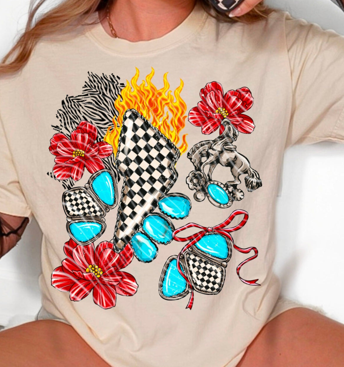 T-Shirt Sweatshirt Crewneck Retro Rodeo Babe – Checker, Flames, & Turquoise Bloom