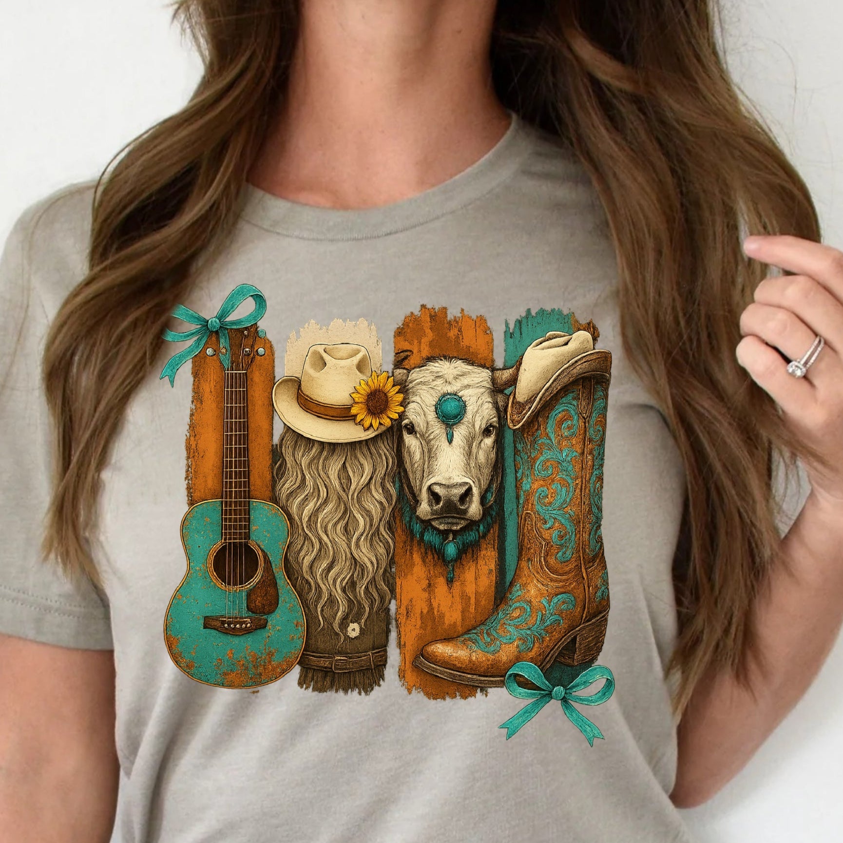 T-Shirt Sweatshirt Crewneck Western Cow – Guitar, Boots, Hat & Highland Print with Teal Accents