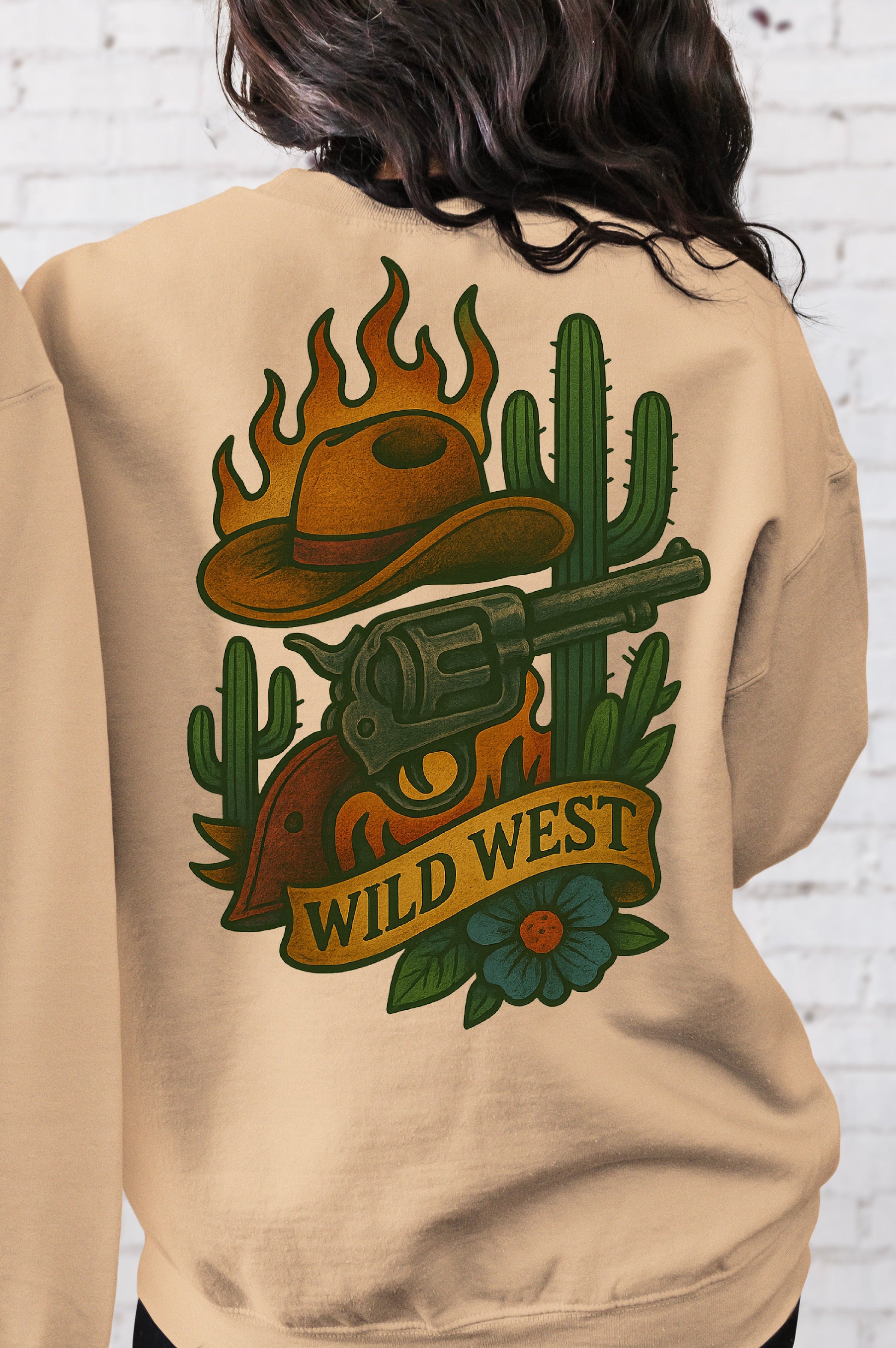 T-Shirt Sweatshirt Crewneck Wild West – Flaming Cowboy Hat, Revolver & Cactus Back Print Design