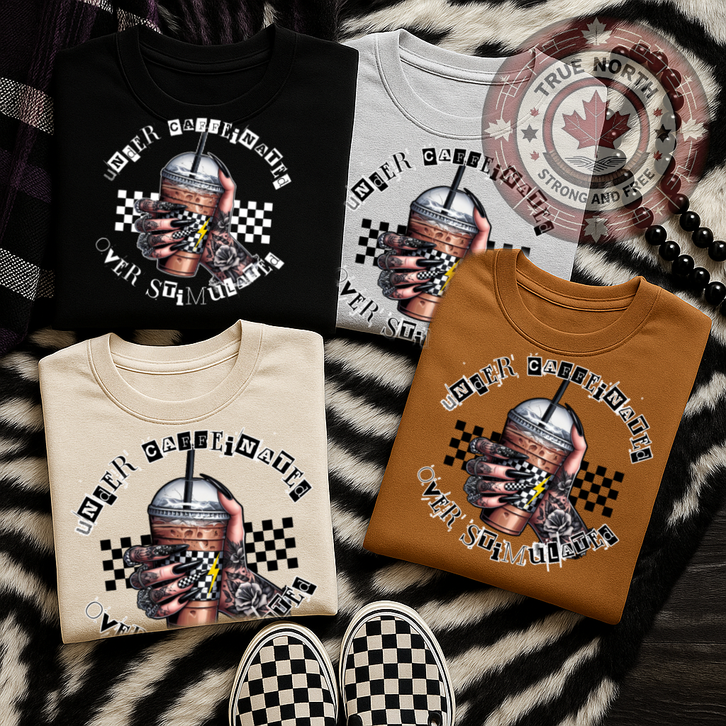 T-Shirt Sweatshirt Under Caffeinated Over Stimulated – Tattoo Hand & Iced Coffee Design