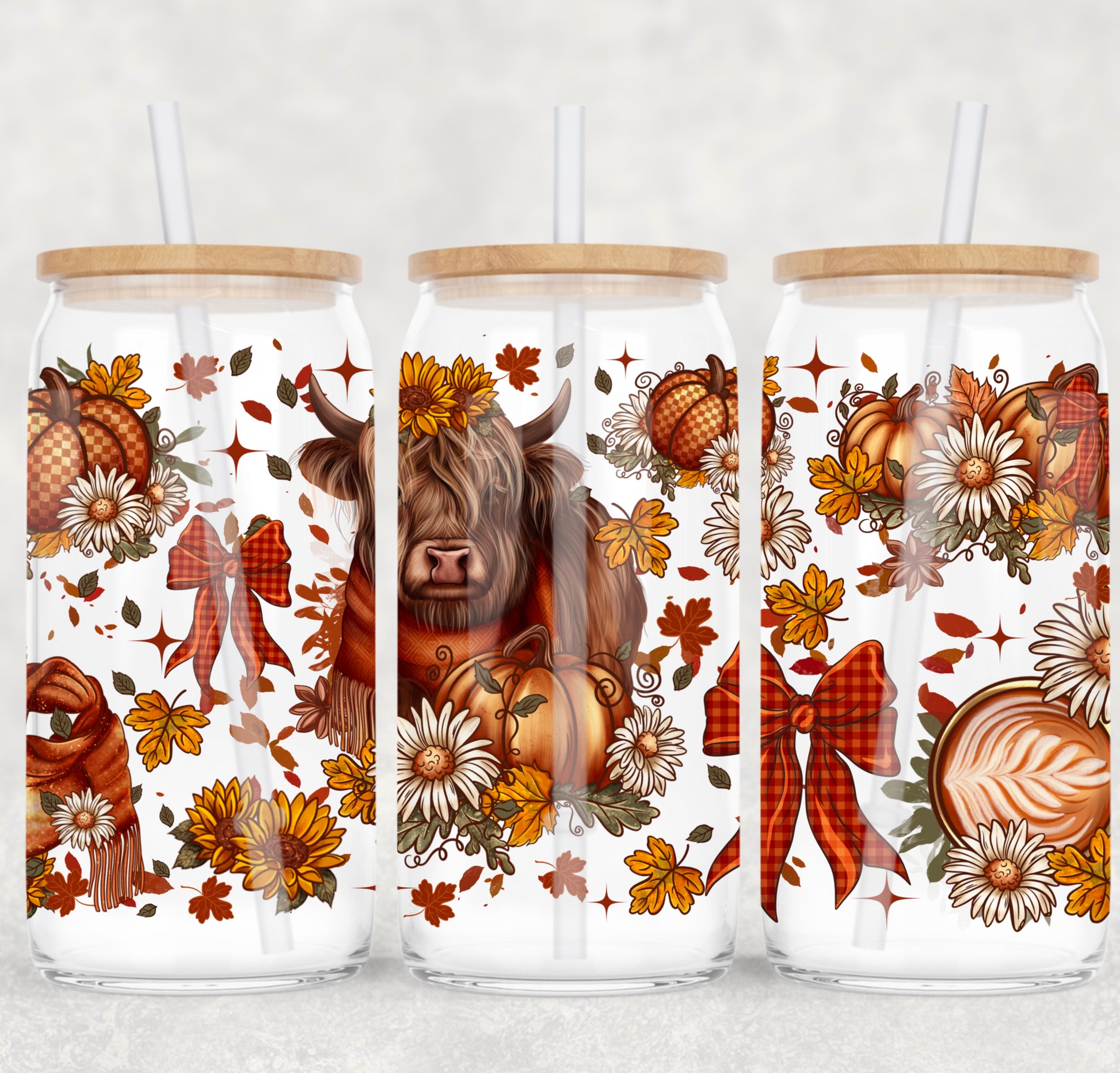 UV DTF Cup Wrap – Autumn Is Calling | Highland Cow, Pumpkins & Fall Florals Glass Cup Decal